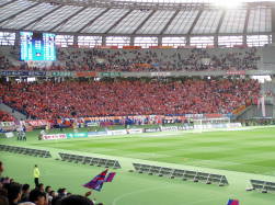 | 新潟のゴール裏。さすが昨年Jナンバーワンの観客動員数を誇ったチーム。アウェイではるばる新潟からこんなに来るとは。でも東京のサポータの方がここでは多いよ、もちろん。 | |