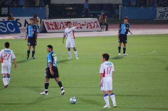 | 本日は川崎市制50周年?記念試合ということで、ハーフタイムに川崎市民にはおなじみの川崎在住タレント、西城秀樹のヤングマンの大合唱。盛り上がりましたね。 | |